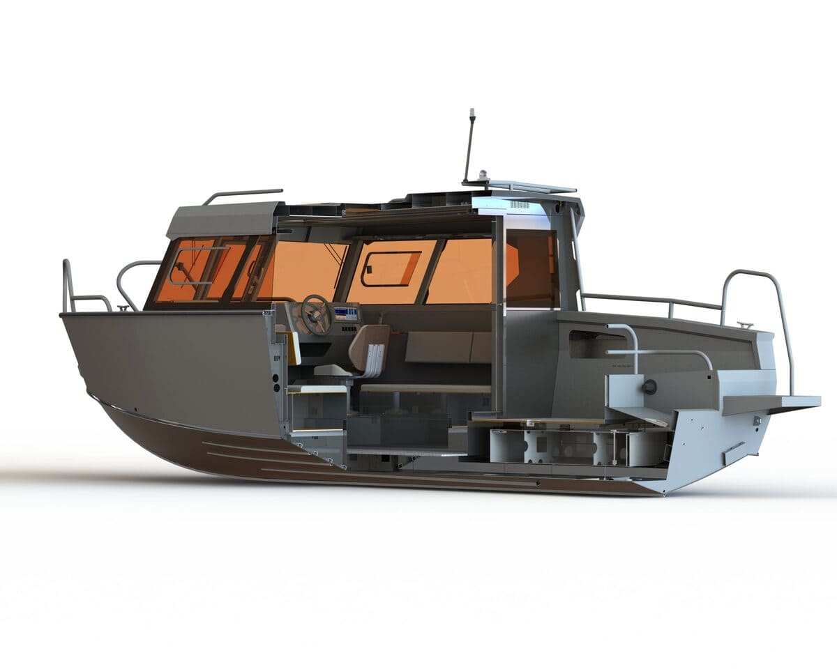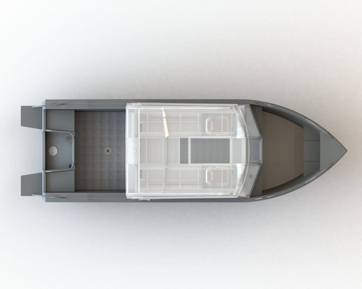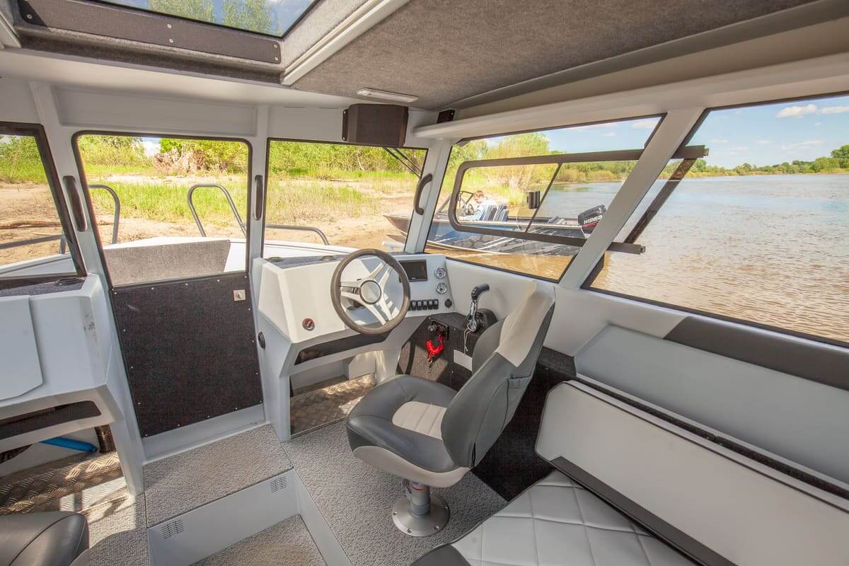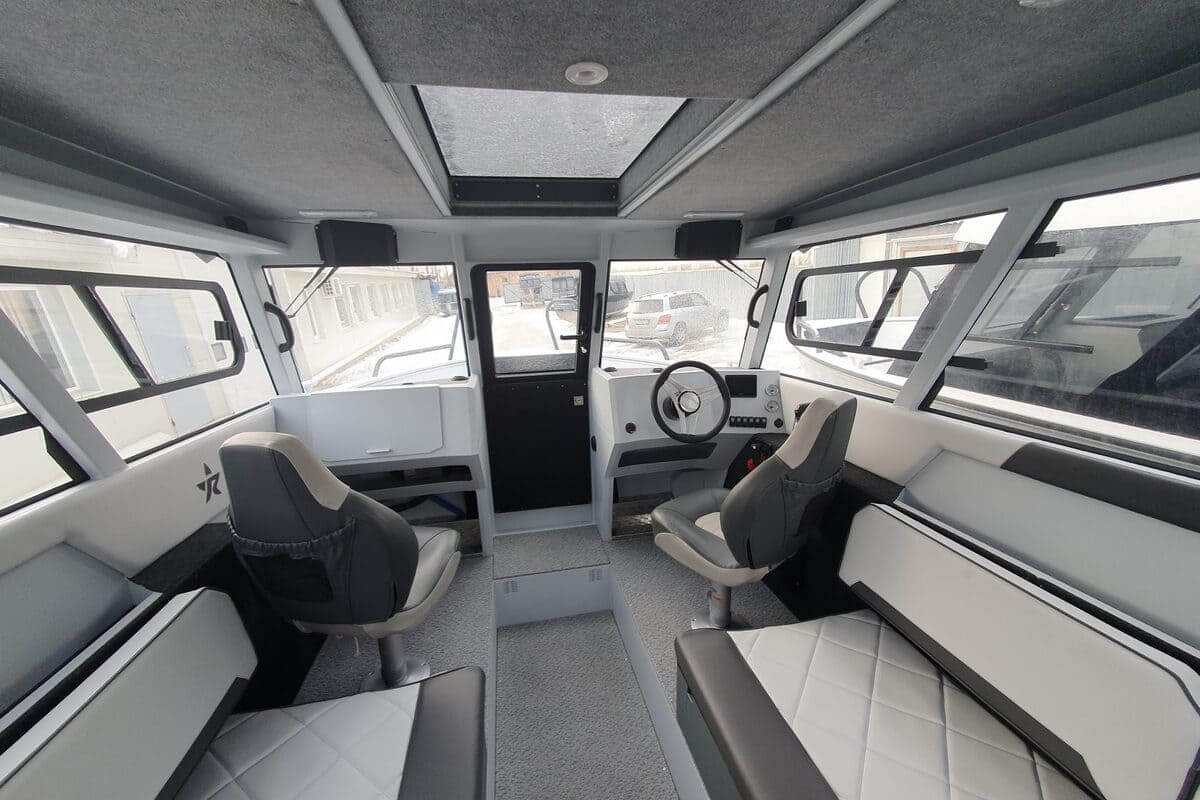 В передней части кабины установлена форточка с дверцей для сквозного прохода. Для выхода на корму установлена панорамная сдвижная дверь. Все остекление выполнено из закалённого стекла. Катер оснащен панорамной крышей со стеклянной вставкой по центру.