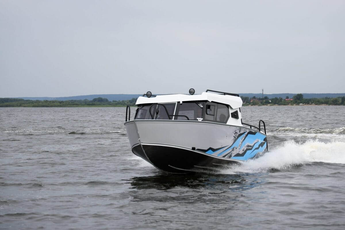 Длина корпуса — 7070 мм, ширина — 2390мм, килеватость на транце — 18 градусов.