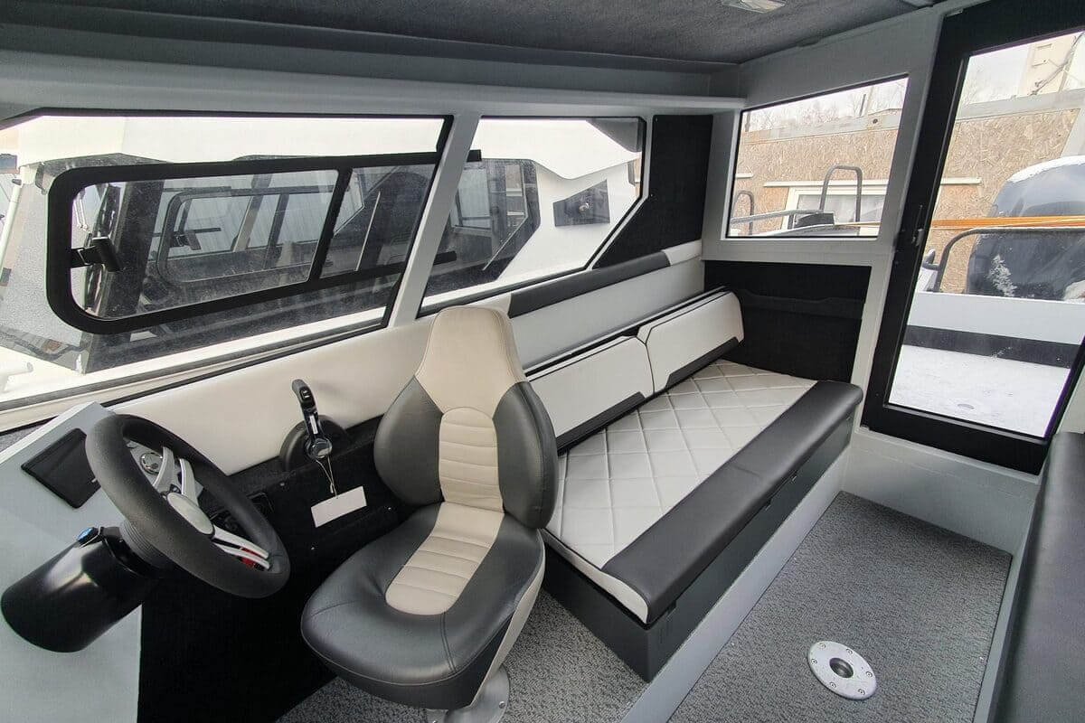 В кабине располагается место судоводителя, пассажира и боковые диваны, на которых свободно могут разместиться четыре-шесть пассажиров. Внутри кабины много рундуков и полок, позволяющих максимально рационально использовать свободное пространство.